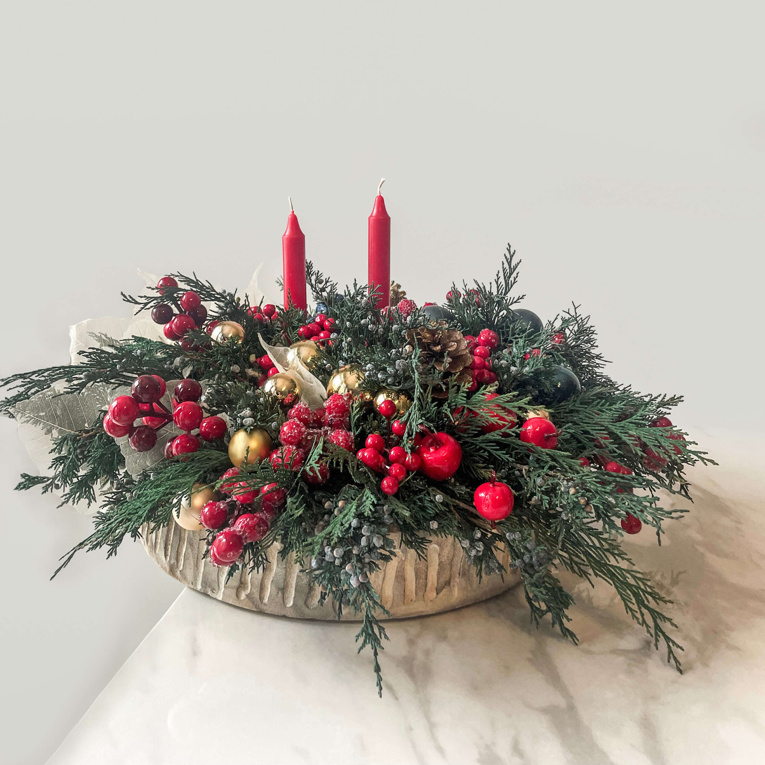 Christmas arrangement with candles in classic style in a wooden bowl. Preserved flowers and holidays decor